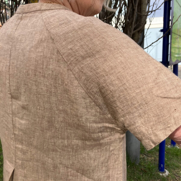Klänning i 100 % linne från GR Natur. A-modell med knappslå och veck både fram och bak, detta ger en rymlig klänning med bra vidd. Kortärmad och rund halsringning. Storlek 38 mäter 106 cm från axeln till fållen nertill. Linne är ett fantastiskt material som är värmereglerande, sval på sommaren och värmer när det kallt. tillverkad i Litauen.