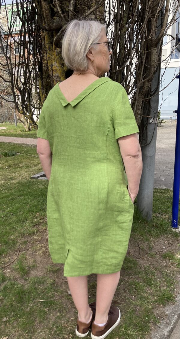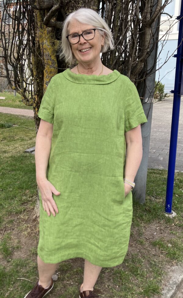 Klänning i grönmelerat tyg i 100% linne, figursydd och välskräddad med den vackra och annorlunda kragen som gör så mycket till klänningens uttryck. Fickor i sidan och ett litet sprund i bak, lite ballongformad modell. Storlek 38 mäter 98 cm från axel till fållen nertill. Tillverkad i Litauen för GR Nature. Sommarens festklänning som sticker ut.