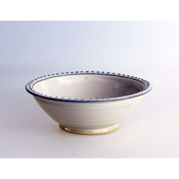 Handdrejad skål till frukosten och efterrätten. Dekor – blå/grå prickar, blank vit glasyr. Målad med engobe (lerfärg) lite upphöjt mönster.