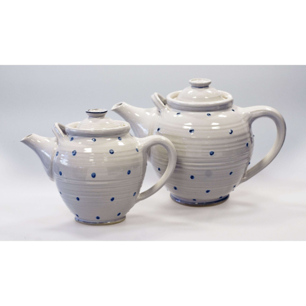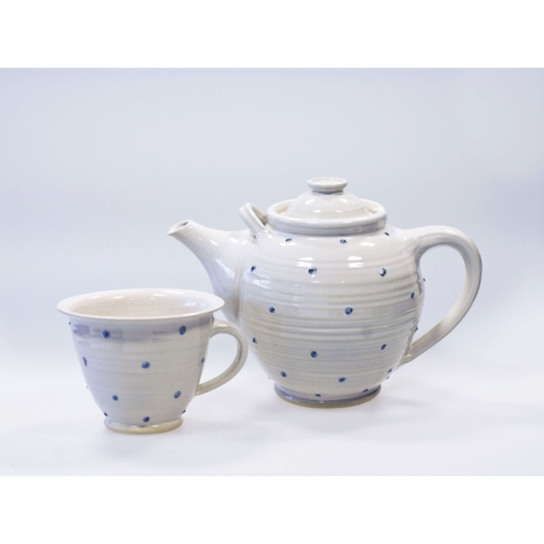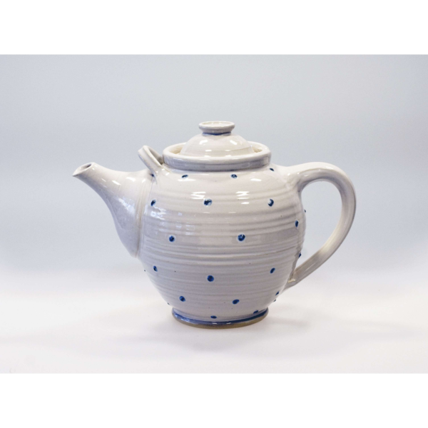 Handdrejad tekanna stor. Dekor – blå/grå prickar. Målad med engobe (lerfärg) lite upphöjt mönster.