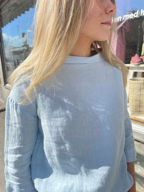 Topp i 100 % linne med krage och trekvartsärm, ljusblå